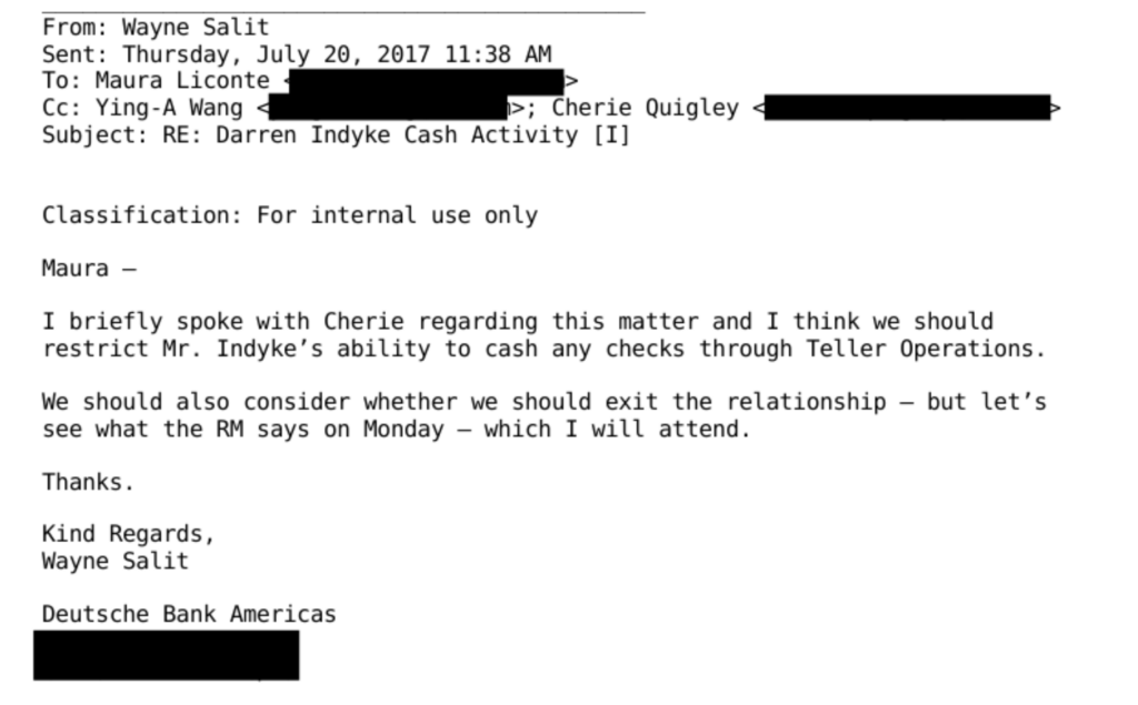 Eventually, the case escalated to Deutsche Bank’s anti-money laundering division, where wealth management agent Cheri Quigley was more direct in her assessment: “This client tends to cash checks frequently and we need the activity to stop.”