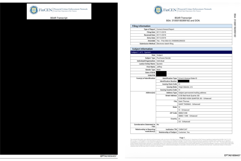 Comparison of two different versions of the same SAR filing, as released by the US Department of Justice. The fully redacted version (left) is currently available from the DOJ website, while the unredacted version (right) was originally uploaded on January 30, 2026. The unredacted copies of the Epstein Files are still available in COURIER’s database of the Epstein Files, created by Thorian AI. Images courtesy US Department of Justice.